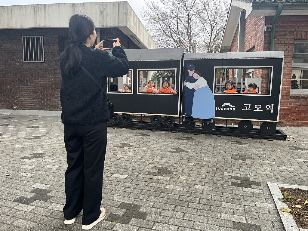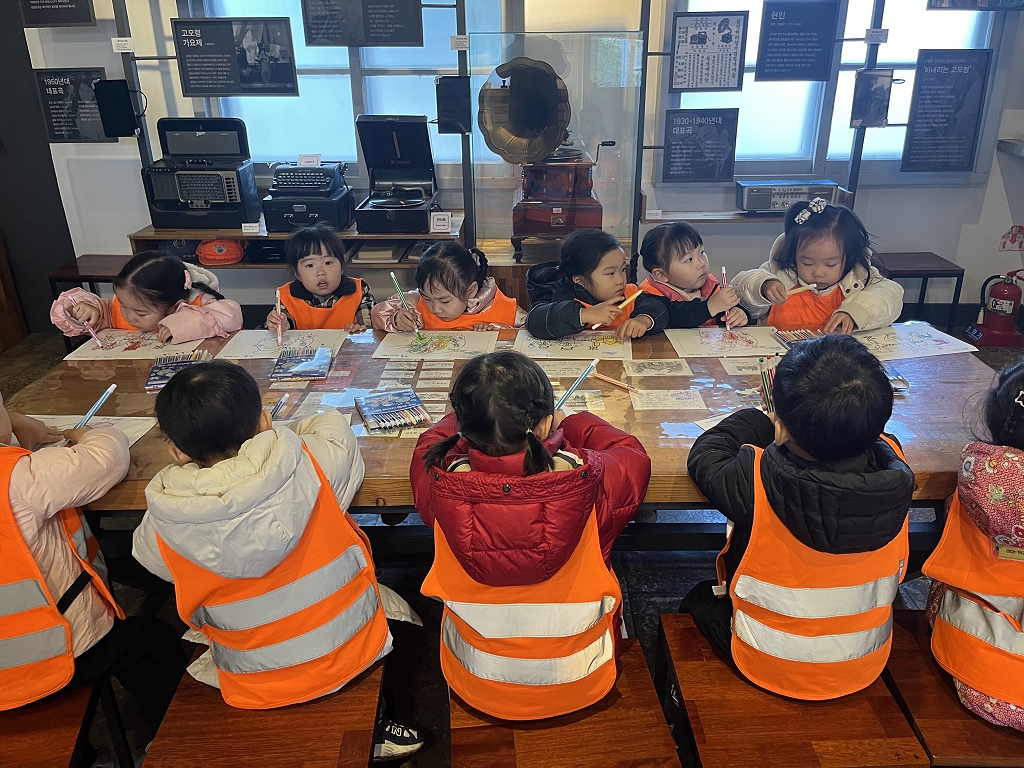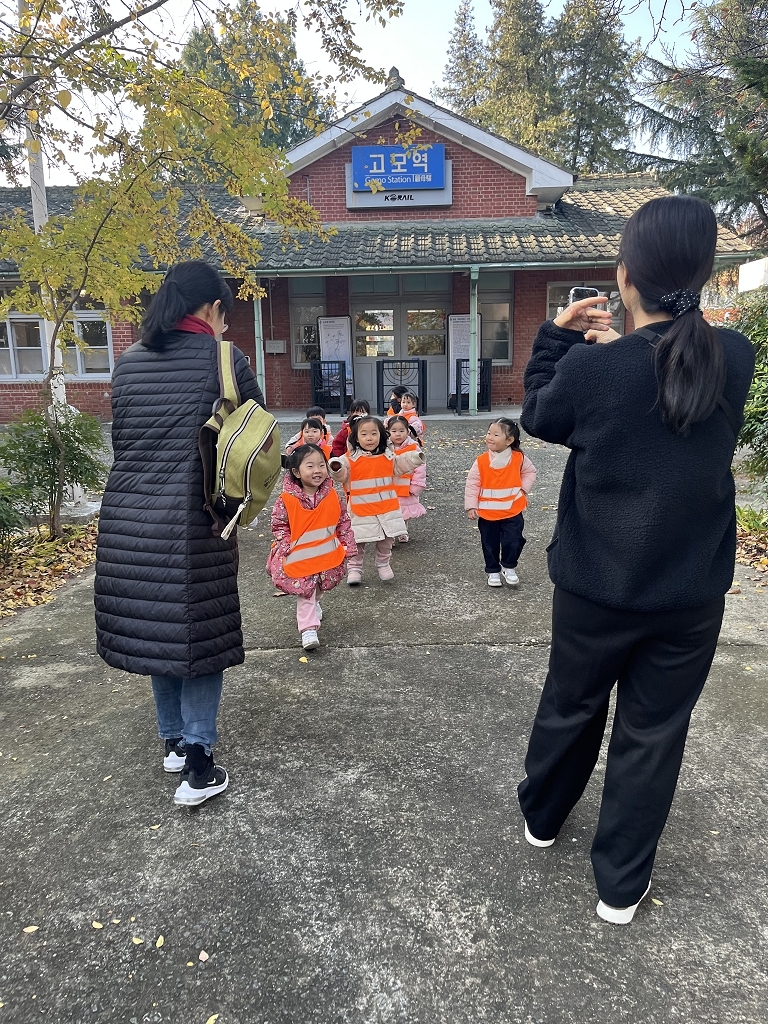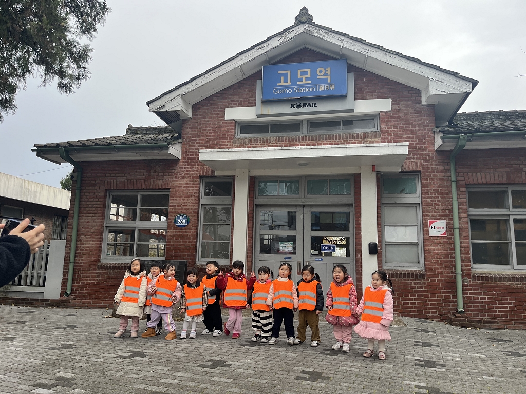아이들은 먼저 고모역 정문 앞에서 도착 기념사진을 찍었습니다. 문화관 테이블에 앉아 그림을 그리기도 하고,