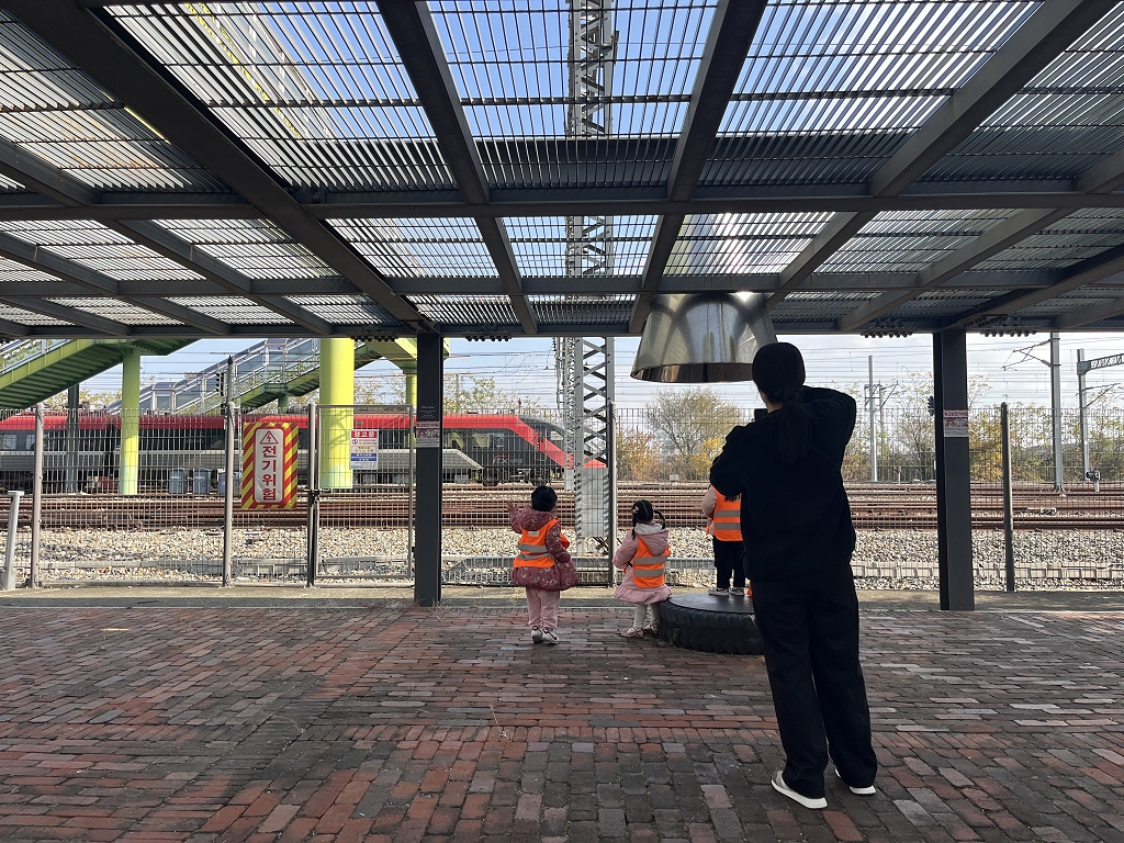 철로를 따라 쏜살같이 지상을 달리는 지구 기차를 신기하게 구경했습니다.