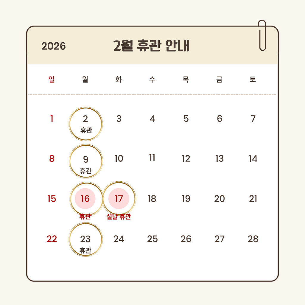 2월은 매주 월요일, 17일 설날 당일 휴관